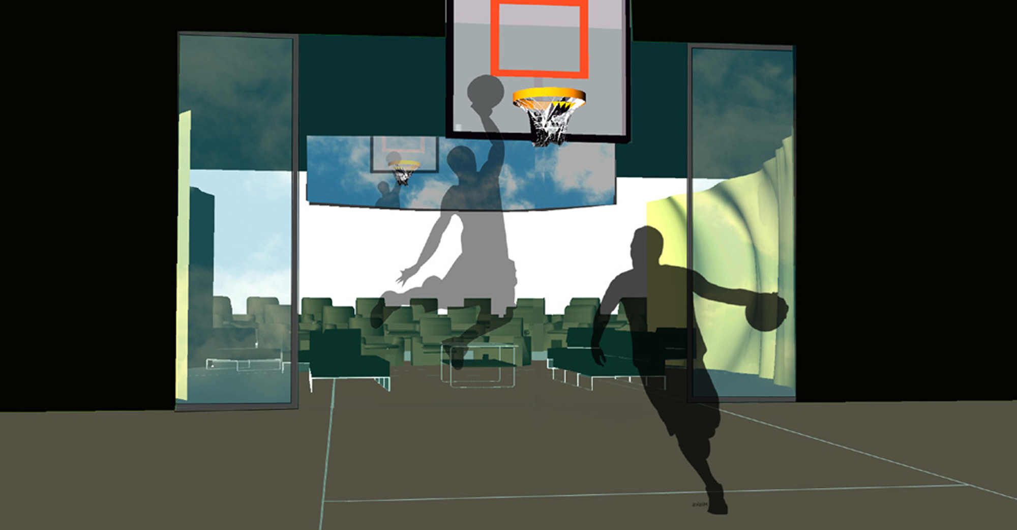 This project was a conceptual introduction for a media company's new studio space. The main clients for this studio were top roster Lakers players, so the design was generated by an inside outside space that doubled as a viewing room for basketball footage and also a small scale half basketball court. The theatre was set up to simultaneously view the virtual games on the media screens and the actual one on one on the in house half court.