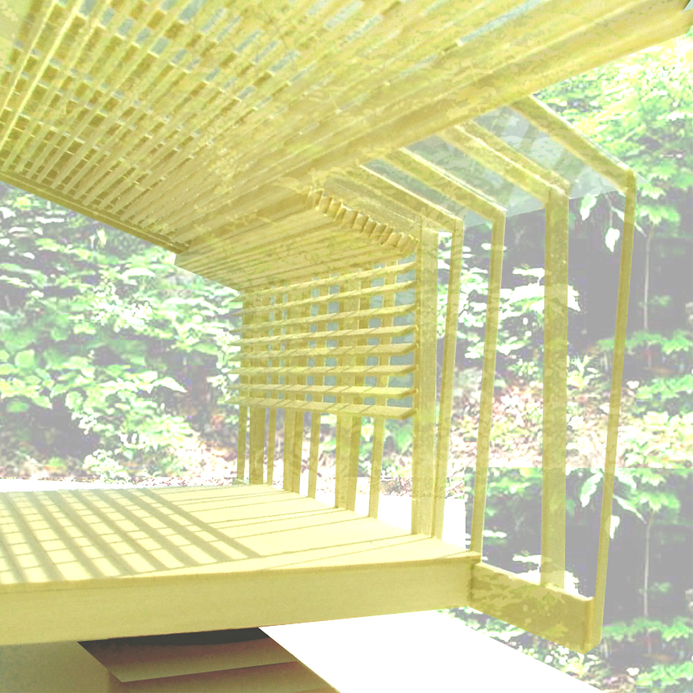 Designed as a viewing point along a lake front, meditation pavilion is an open air structure for communal gathering in nature. The viewscape faces west toward the setting sun. With slatted louvers for star gazing at night and optional shade during the day, the operable pergola wraps like one continuous textured fabric skin from front to back.